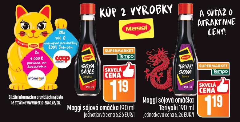 Do súťaže sa zapojíte tak, že v čase jej trvania, od 01. 03. 2026 do 30. 04. 2026, nakúpite akékoľvek 2 výrobky značky Maggi a zašlete emailom na maggiczsk@nestle.com scan pokladničného dokladu spolu s údajmi (meno a priezvisko, adresa, telefónne číslo).